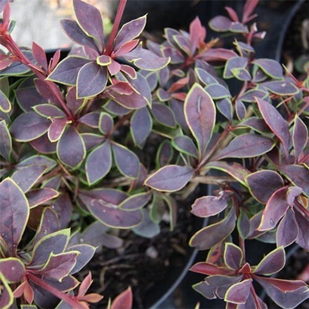 Оригинальный сорт, имеющий нетипичную для барбарисов приземистую, раскидистую форму кроны. Прекрасное почвопокровное растение. Окраска листвы очень необычная: ярко-пурпурная с хорошо выделяющейся широкой (около 1мм) желтоватой каймой по краям.