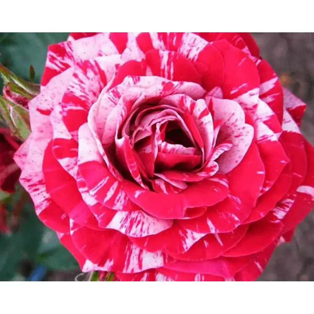 Цветки у розы Пурпурный Тигр довольно крупные, диаметром 8-9 см, с полумахровым венчиком, собраны в соцветия по 3-5 штук. Бутоны аккуратные, яйцевидные, фиолетового цвета, с заметными бело-розовыми мазками. В полном роспуске венчик чашевидный, уплощенный, с высоким центром. Окраска лепестков полосатая, пурпурная, с пятнами белого, сиреневого и розового цвета. Аромат у розы слабый, с нотками мускуса.