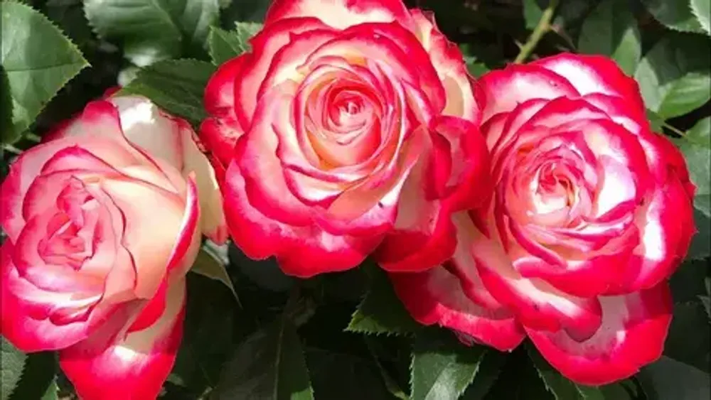 Роза выгоняет бутоны бордово-кремового цвета. Окраска раскрывшихся цветков – бело-розовая. Они достаточно крупные, обладают бокаловидной формой. Оригинальный вид им придает малиновая кайма. Диаметр цветков составляет 9-10 см. На одном стебле насчитывается от 2 до 5 бутонов.